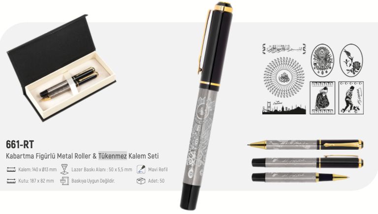 661-RT Kabartma Figürlü Metal Roller & Tükenmez Kalem Seti